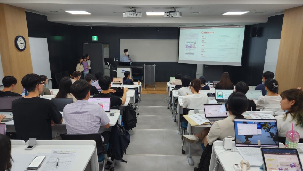 20일 오전 미래관 B107호에서 열린 <공공부문 디지털전환전략> 최종발표회는 네이버(김동희 프로)와 서울시설공단(상가운영 팀장 곽영천 외 1명)이 참여한 가운데, △경영학부 송지희 교수의 개회사 △팀별 소상공인 디지털전환 전략 및 결과 발표 △네이버 및 서울시설공단 담당자의 질의응답 및 피드백 등의 순서로 진행됐다.