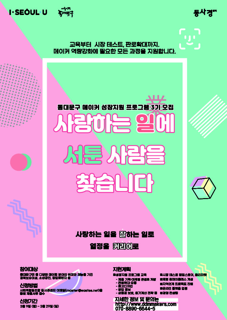 사회적협동조합 동사경센터가 이달 9일(월)부터 3월29일(일)까지 ‘동대문구 메이커 성장 지원 프로그램’ 3기 참여자를 모집한다.